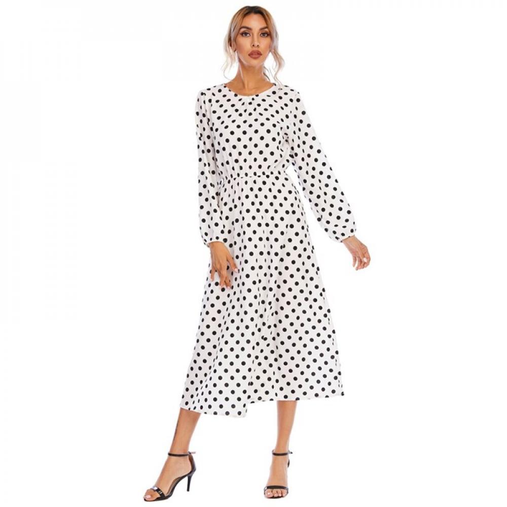 Wisremt Fashion Women Wave Point Print Chiffon Dress Ladies Round Collar Waist Long Summer Dresses White M Walmart Com